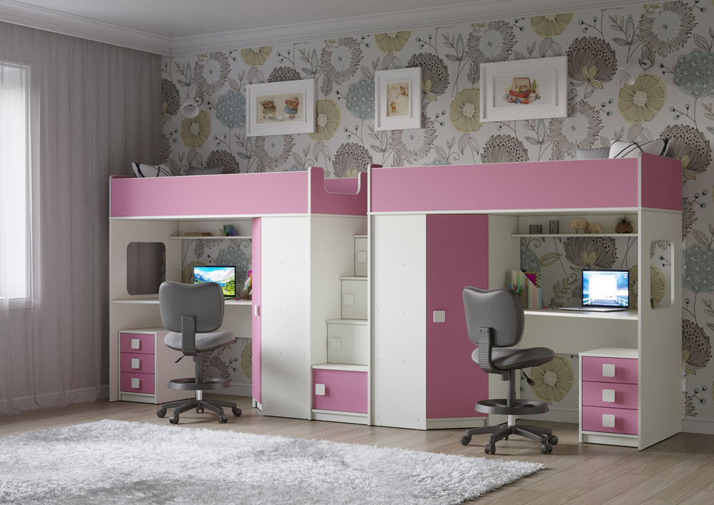 Под спальным местом для каждого ребенка располагается рабочее место с встроенным столом и тумбой.