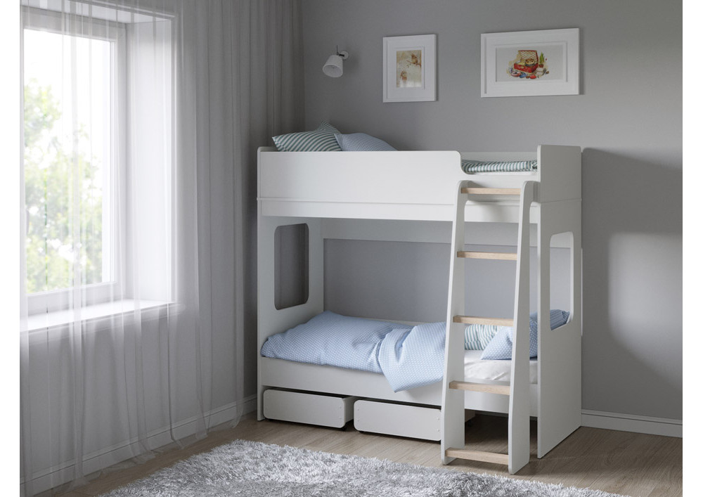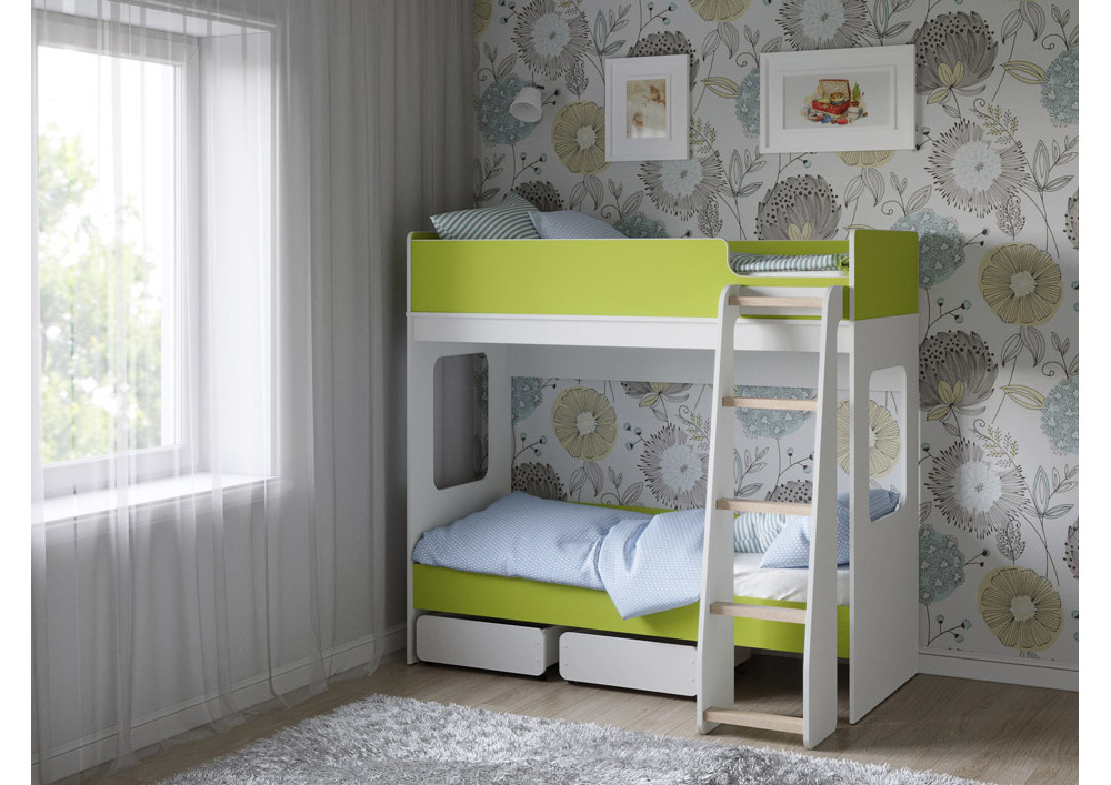 2 ящика внизу кровати обеспечат хранеие игрушек и порядок в комнате. Ящики оборудованы прямохоными колесными опорами.