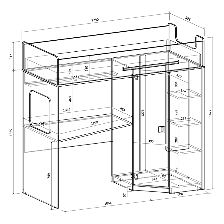 Учебная зона со столом под спальным местом открывает возможности для письменных работ, а также здесь удобно расположить ноутбук. Тумба Л-04 обеспечит хранеие канцелярских принадлежностей и учебников.